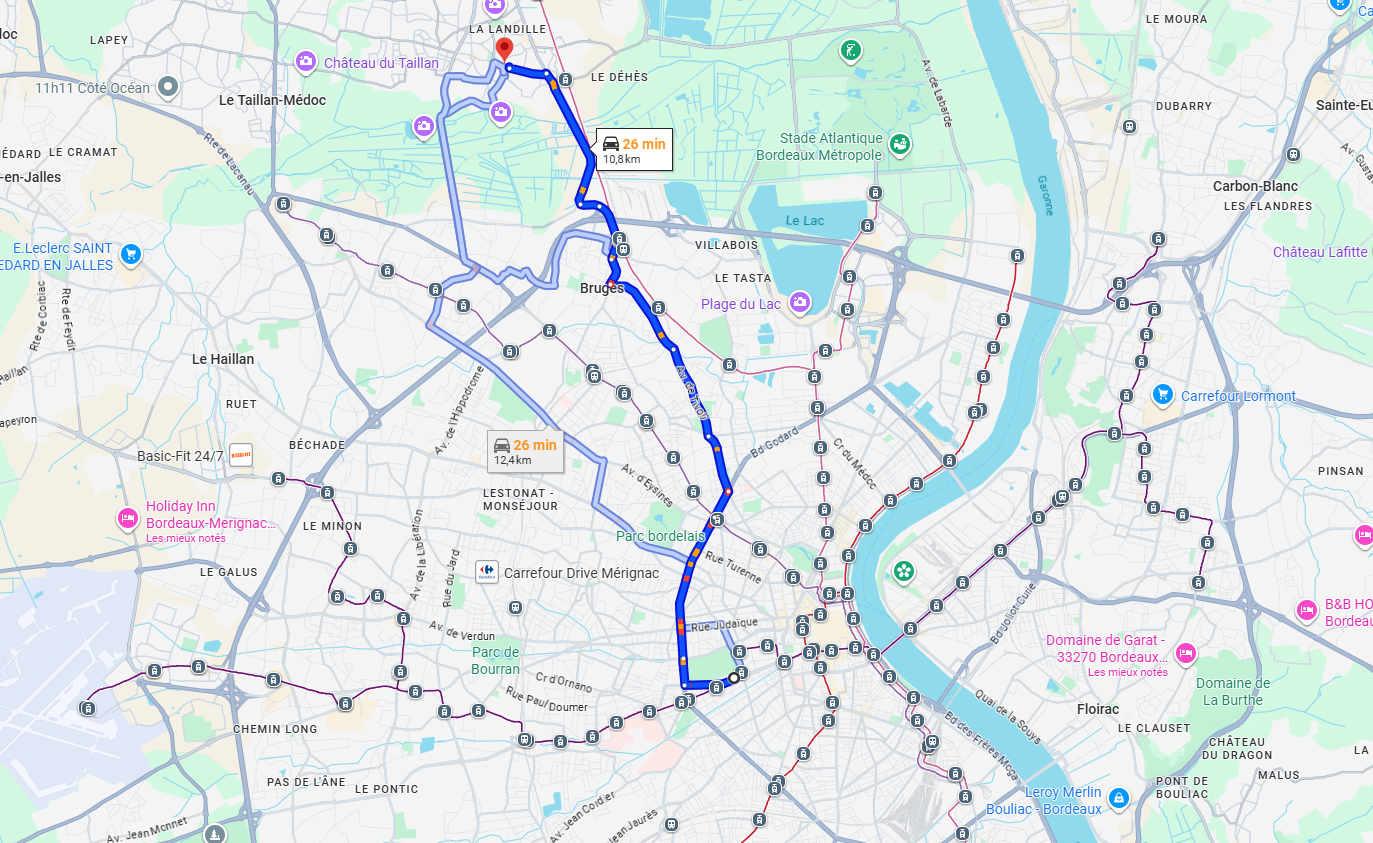 À Bordeaux, par exemple, le motard a mis 23 minutes pour parcourir un peu plus de 10 km, contre 37 minutes en voiture et 1 h 04 pour le piéton + transports en commun.