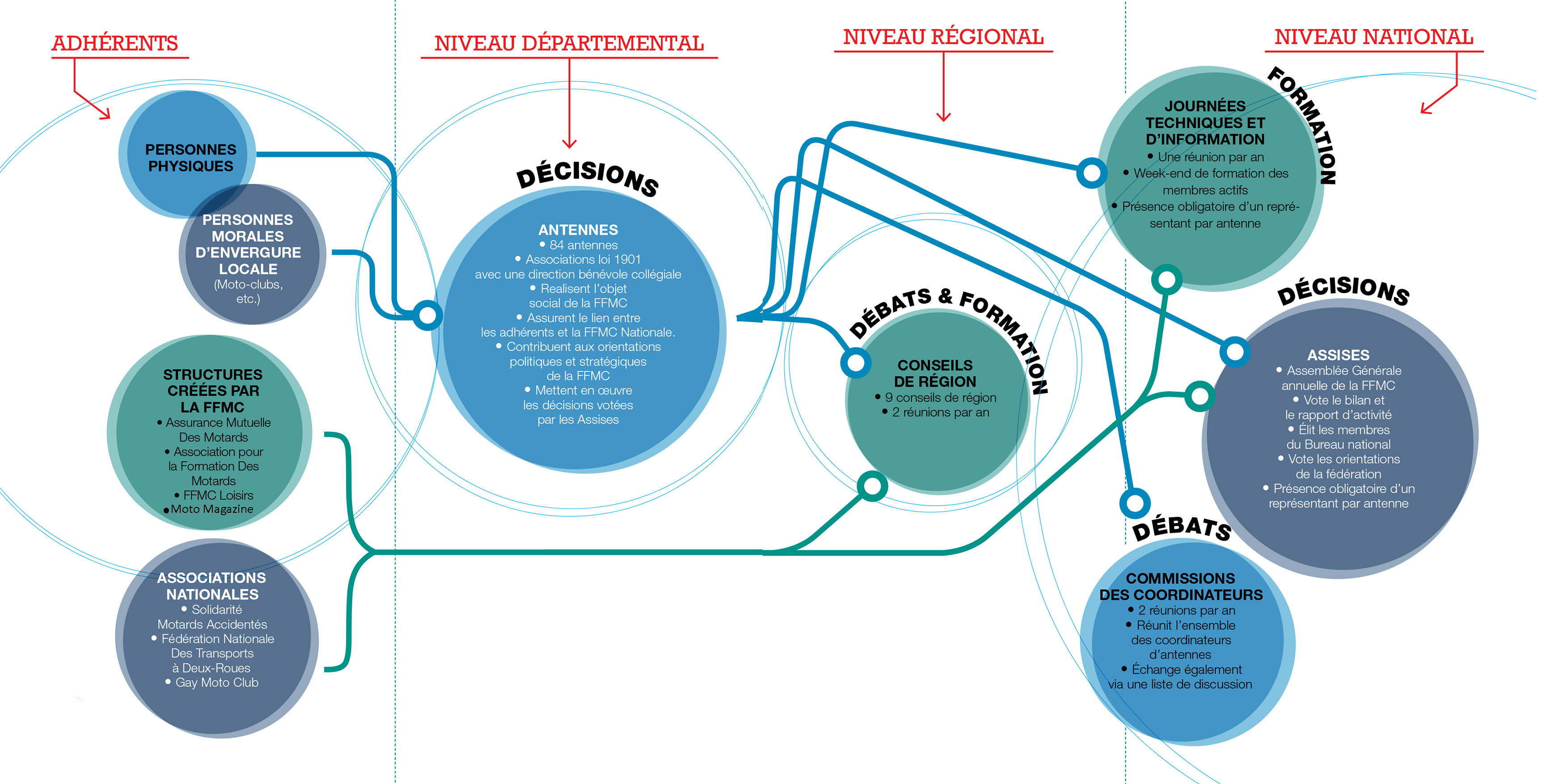 C’est la vocation de ce schéma que d’expliquer tout cela, de montrer la partie immergée de l’iceberg FFMC qui veut permettre à ses adhérents ou sympathisants d’apprendre, de contribuer, de décider ensemble.