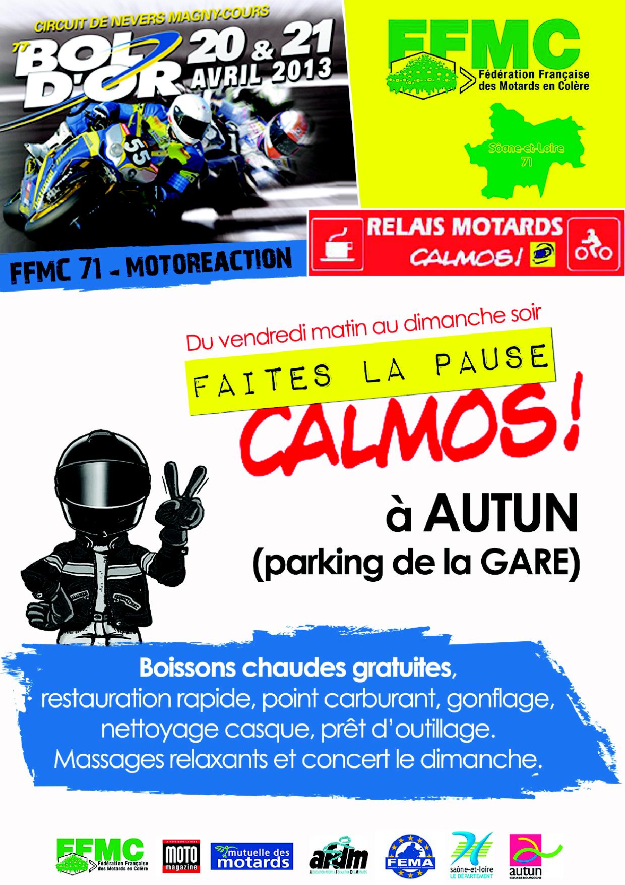 Du vendredi 19 avril au dimanche 21 avril 2013 se tiendra à AUTUN, la 11ème édition du Relais CALMOS en Saône et Loire à l’occasion du Bol d’Or motocycliste organisé sur le circuit de Magny-Cours dans la Nièvre.