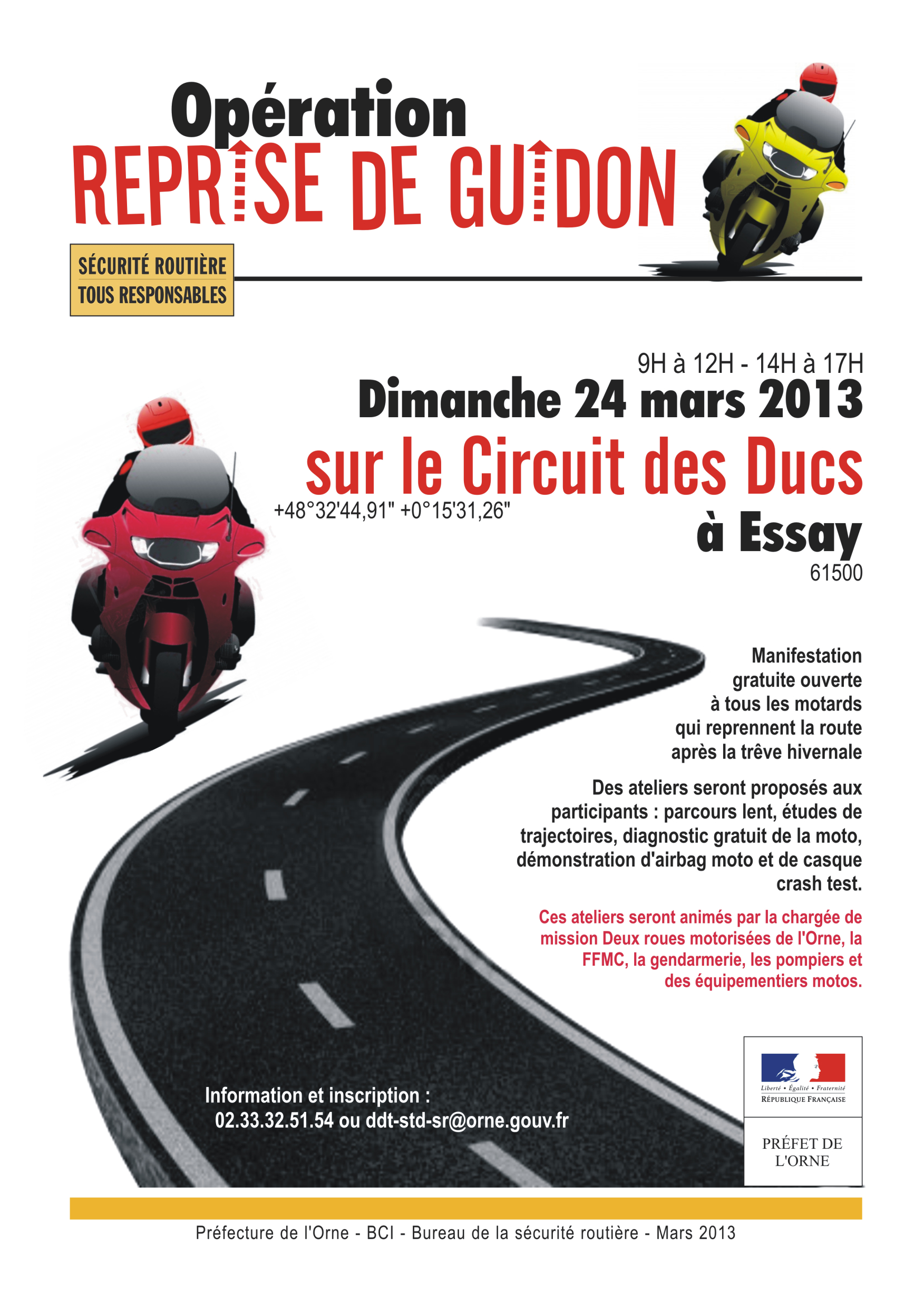une journée reprise de guidon est organiser par la sécurité routière sur le circuit des ducs à essay (61) le 24 mars 2013 .des stands d’équipementiers (baxter et son gilet air bag , moto expert d’alençon ,FFMC 61, etc ) slalom et trajectoire sur le circuit ,puis mise en application sur route ouverte un parcourt de 10km est prévus pour ça le tout encadrer bien sur , crash casque etc ...