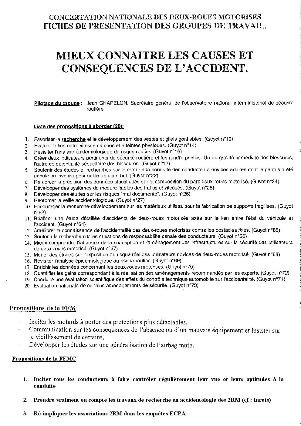 La FFMC participe à la concertation sur la sécurité des deux roues motorisé lancée à l’initiative de la DSCR (Direction de la Sécurité et de la Circulation Routière) le 5 juin dernier. Dans un souci de transparence, et afin de rendre compte auprès de ses adhérents et plus largement auprès du monde motard des discussions qui interviennent dans les différentes thématiques (formation, infrastructures, réglementations, etc...), la FFMC a mis en place un blog qui sera alimenté au fur et à mesure des avancées des travaux de la concertation , et au gré de la disponibilité des participants.