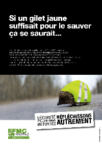 Ainsi est née cette série de 6 affiches. 5 d’entre elles illustrent un thème important parmi les mesures que nous refusons à savoir : l’obligation du port de « dispositifs rétro-réfléchissants », l’agrandissement des plaques d’immatriculation des motos, la verbalisation abusive de la circulation inter-files, l’implantation des radars « pédagogiques » (que nous préférons appeler démagogiques…) ou la mise en place d’un contrôle technique inutile et coûteux sur les cyclomoteurs. Une 6ème concernant les infrastructures routières inadaptées aux deux roues motorisés et notamment le doublement des rails de sécurité.