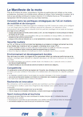 Le motocyclisme s’inscrit pleinement dans la vision actuelle de l’Europe, qui place la qualité de vie de nos concitoyens au centre de ses préoccupations tout en promouvant un leadership industriel durable. Afin de tirer parti de tout le potentiel de notre secteur pour atteindre des objectifs aussi ambitieux, le manifeste actuel identifie cinq domaines stratégiques pour renforcer la coopération entre les autorités publiques, les utilisateurs et l’industrie du motocycle tout en soutenant les politiques de mobilité et de transport : la sécurité, l’environnement et la durabilité, la compétitivité, la R&D, le sport automobile et le tourisme.