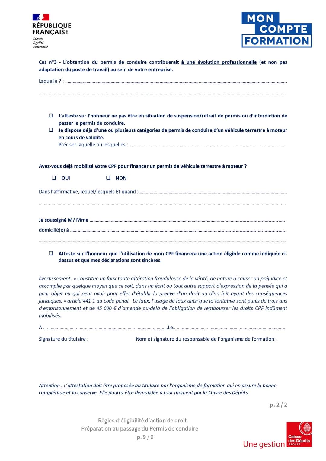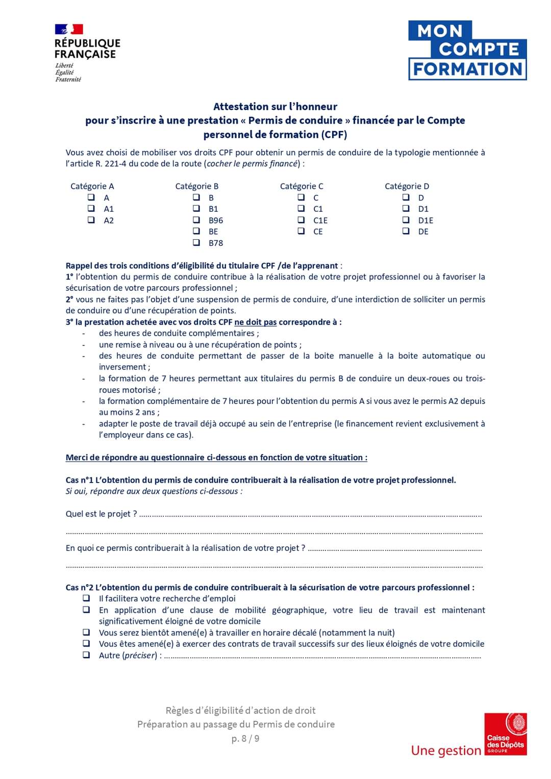 Une déclaration sur l’honneur (voir document en bas de page) fournie par la CDC (Caisse des Dépôts et Consignations) est demandée afin de justifier que le financement de la catégorie de permis est obtenu dans ce but.
