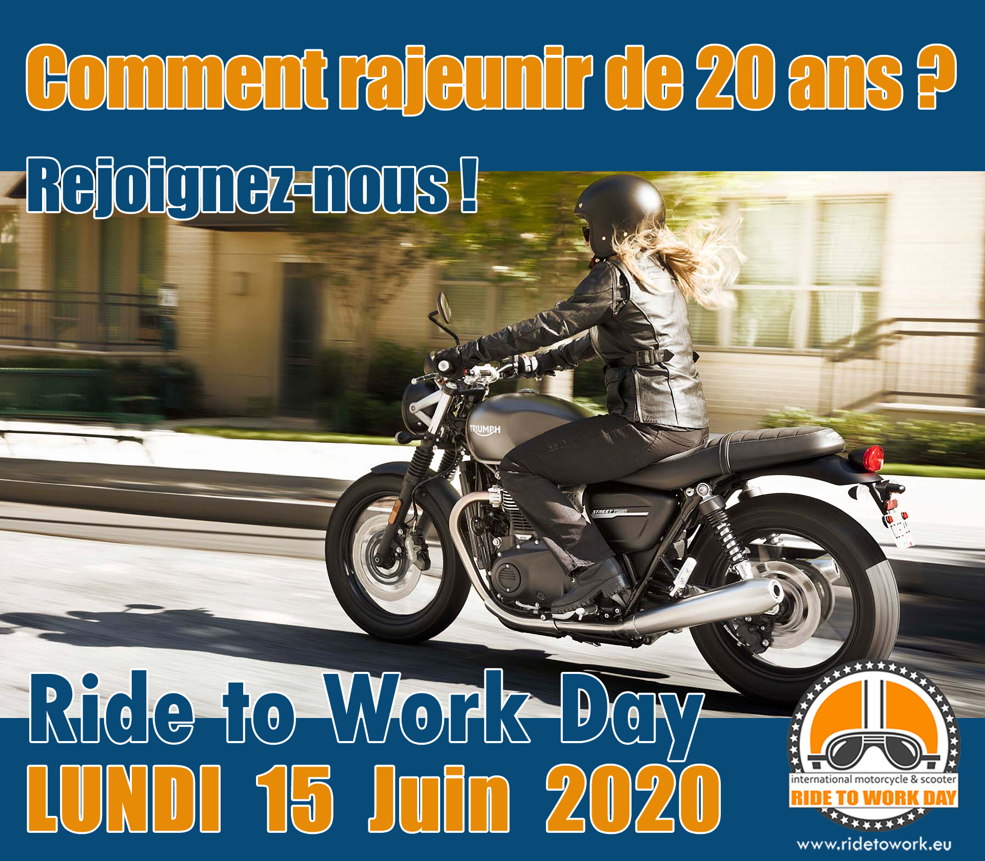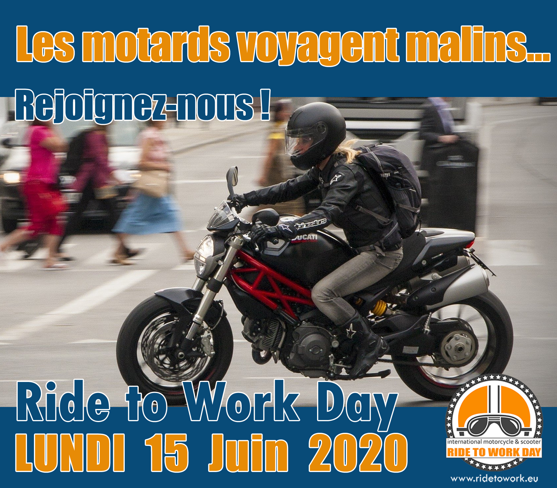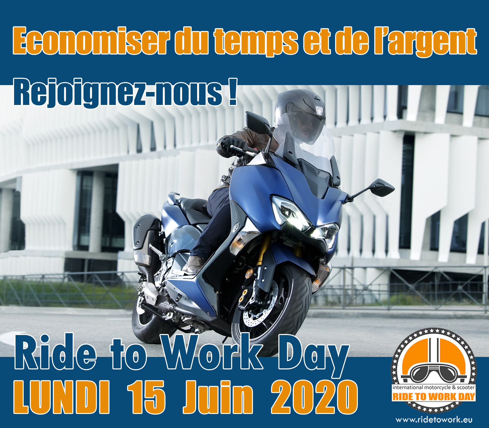 L’opération « ride to work day », relancée par la FEMA (Federation of European Motorcyclists Associations), se déroule chaque année le 3e lundi du mois de juin. Le 15 juin sera donc LE jour pour se rendre sur son lieu de travail à moto et parler des avantages du deux-roues motorisé comme moyen de transport à vos amis, collègues ou employeurs.